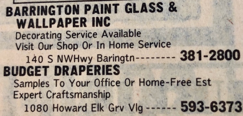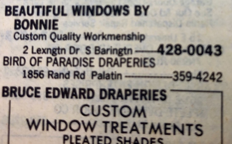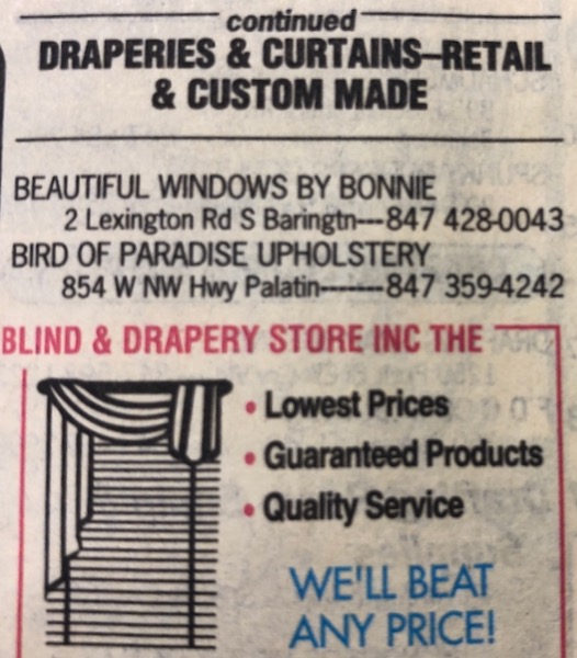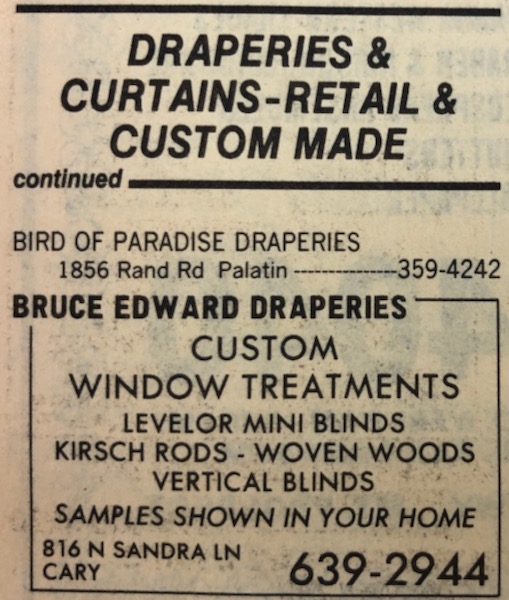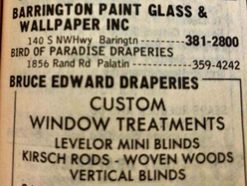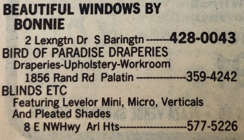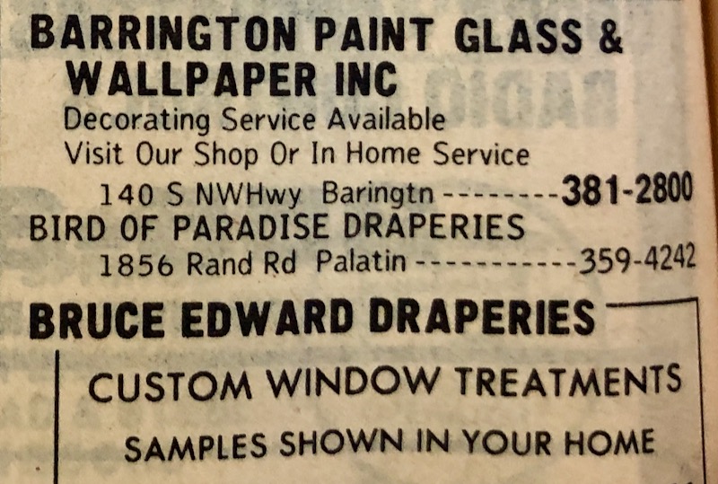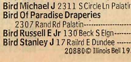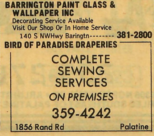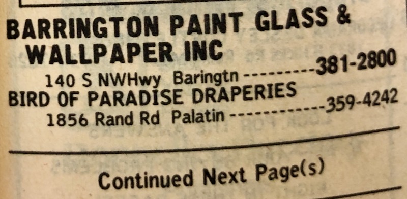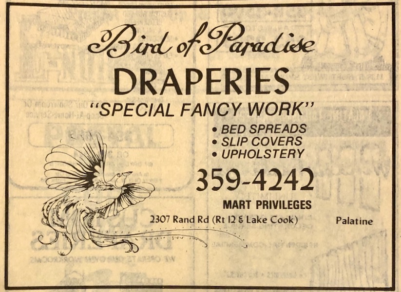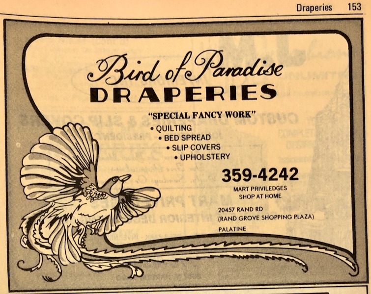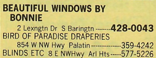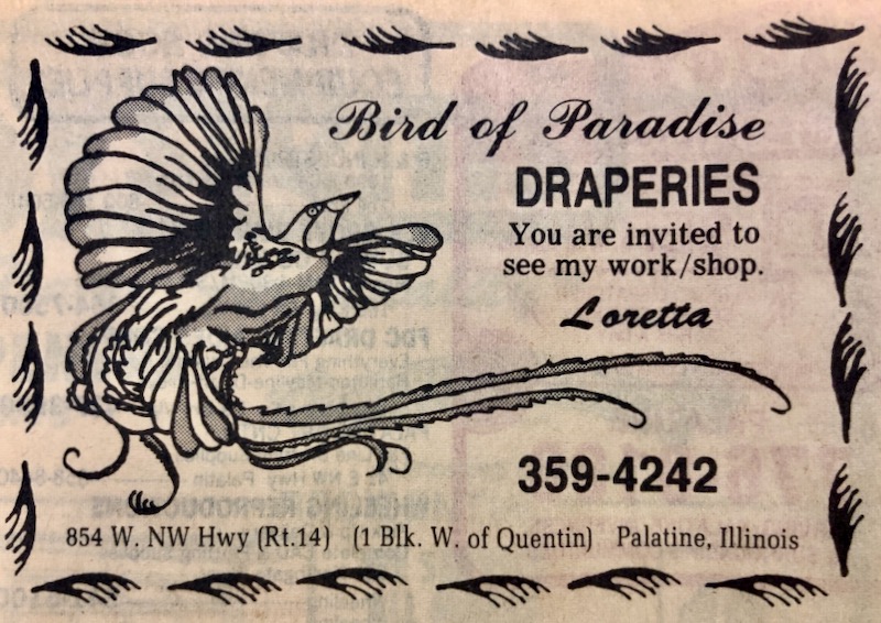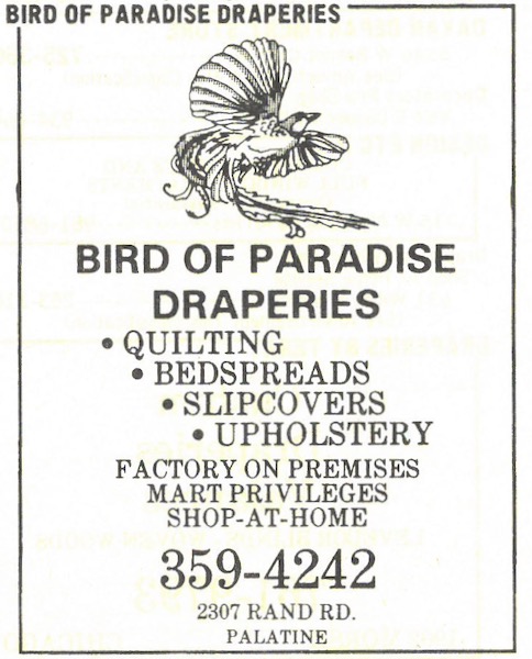 Donnelley made mistakes and forgot to include the Bird of Paradise ad in some years. There was also at least one instance where they forgot to include even a listing, which was definately their mistake because the phone number was the same from 1973-2004. When the phone book listing and ad was left out, Loretta had to resort to newspaper ads and signs in front of the store to generate new business. Donnelley refused to compensate her for the extra cost, they only refunded her payment because their contract refused to accept any liability for mistakes, even theirs. After that, Loretta stopped paying for ads since she could not depend on them to include it. She also received a growing amount of word-of-month referrals for new customers. These ads were scanned from phone books archived at the Palatine Historical Society and the Palatine Library. Shop History Timeline in Palatine, Illinois